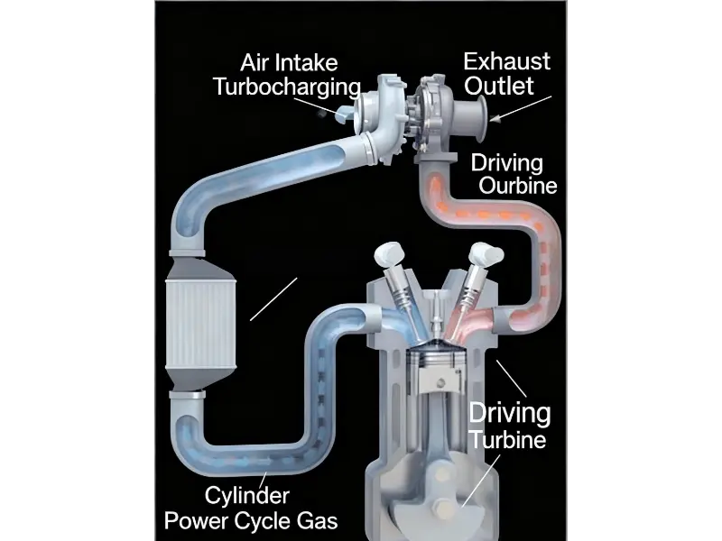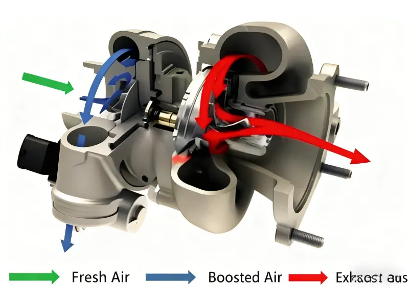 1、 Uitlaatgas wat uit die enjin kom, laat die turbine draai.